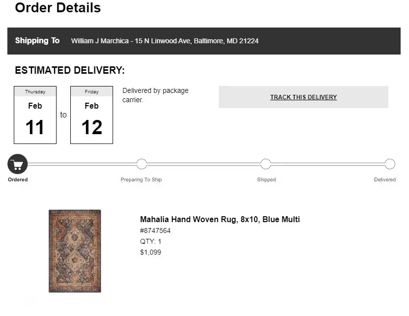 The issue that I have with this is that the delivery people from Pottery Barn (assuming that they are not lying about leaving the rug on the sidewalk in front of my home) did not even knock on the door to alert me to the delivery. Instead, they elected to leave the rug outside of my home on a heavily trafficked portion of sidewalk right next to Patterson Park in Baltimore City without so much as a knock on the door! I never saw the rug that I ordered, but allegedly it was delivered and now I am out $1, 099 without any rug to show for it.
