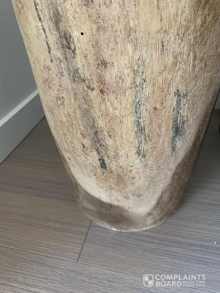 I placed an order for this vase on 6/25/21 which arrived on 7/7/21. Upon opening the product, a strong scent of cigarettes escaped the box. Inside I found an item that looked nothing like the vase that was advertised. The outside was never white washed (as was advertised), it was full of dark stains and burn marks, and was clearly an unfinished product that they forgot to paint in the warehouse. The item is so ugly there is no way the website would include images of it on their customer photo page. The scent was stinking up my apartment that I rent so I threw away the vase as it served no purpose except to damage my apartment. I spoke to two customer service reps on two different days (submitted 7/7, replies 7/8 and 7/9), both of which would not offer anything in return unless I returned the item. I would like a refund immediately -- keep in mind this thing is $200 + tax/shipping ($238).