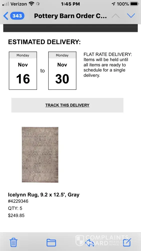 I ordered a rug in aug and never received it. I have called several times and emailed pottery barn with no response. All customer service reps gave me the runaround and kept telling me it is on its way with no tracking info. I finally got a straight answer that the rug is not available and was cancelled weeks ago... I am still out the $ with no refund...