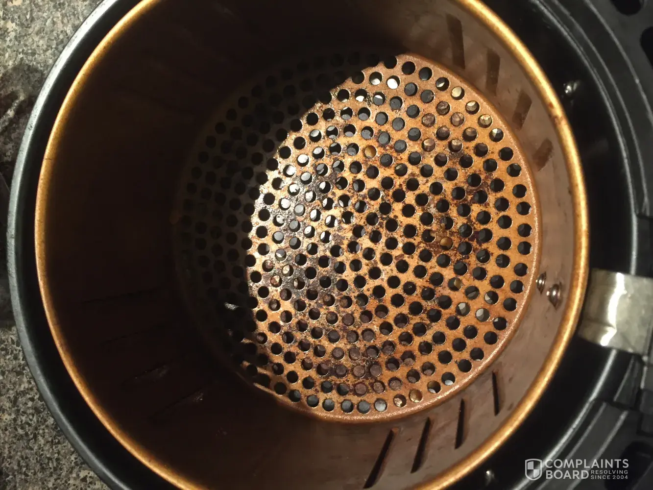 The paint in the bottom basket has peeled and the metal is rusted, the basket itself is corroding and the clip that holds the two baskets together as soon as I pull it out of the airfryer it separates and the bottom basket either falls to the counter or onto the floor, needless to say I'm not using it anymore which makes me sad.