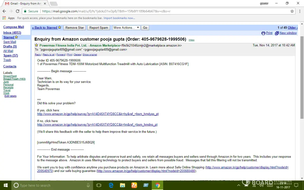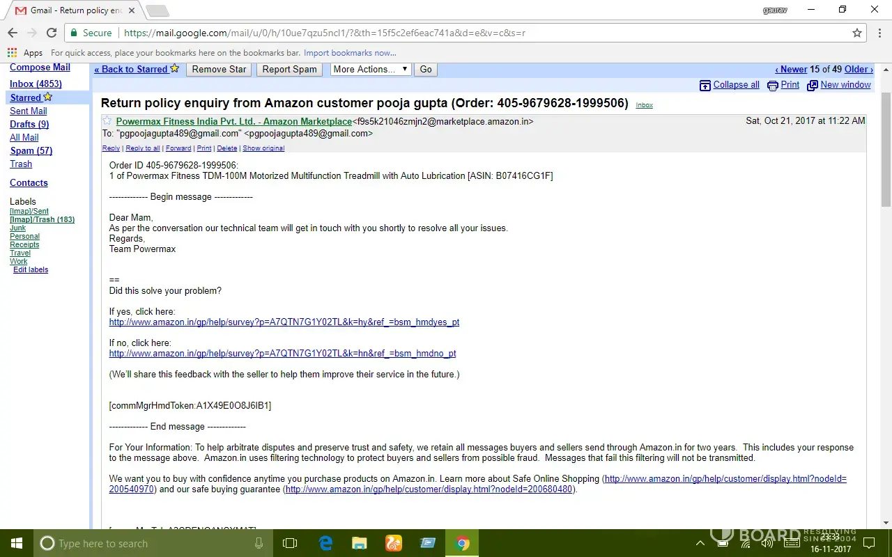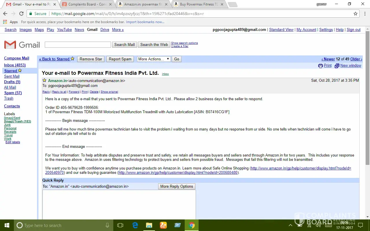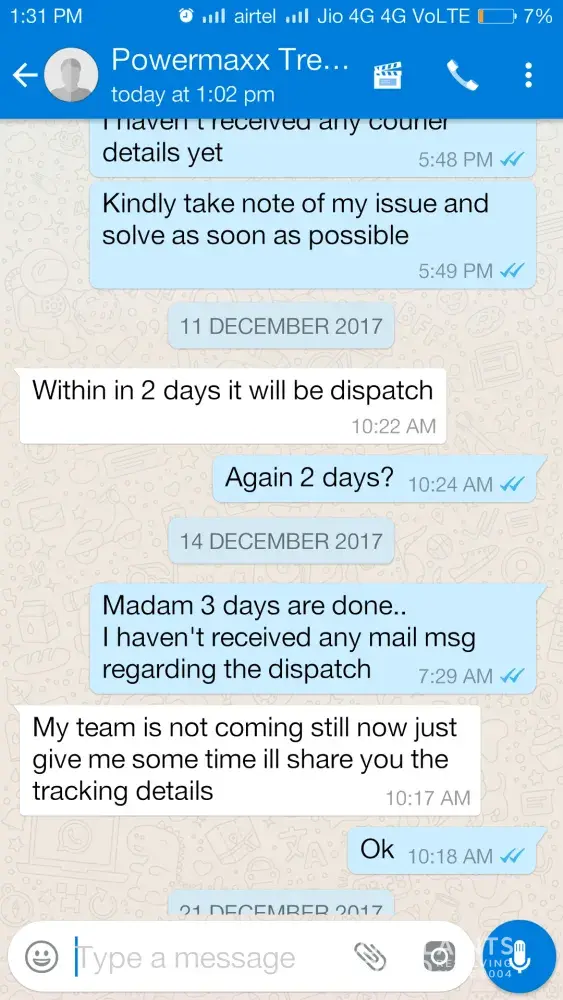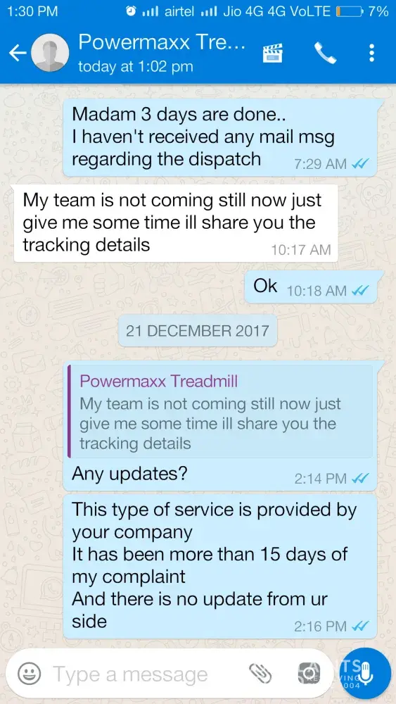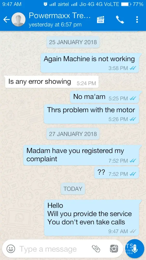 After almost 15 days usage treadmill stopped functioning. I made my first complaint to powermax fitness by phone call on 18/10/17 and called continuously for three days but nobody responded then I made my complaint through amazon and got a response mail by powermax fitness on 21/10/17 assuring to resolve my problem as soon as possible but all I got was their mail promising.. After a long follow up by e-mail and calls they sent a technician on 04/11/17 who was unable to resolve the problem.. Since then nobody visited.
