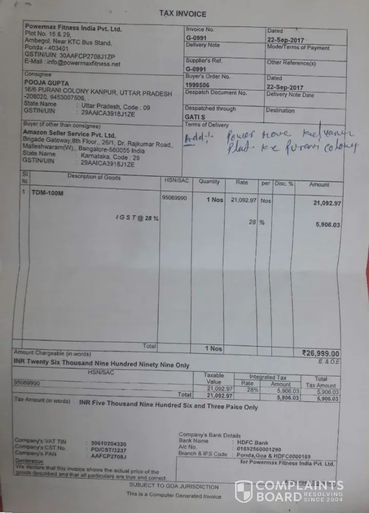 I purchased powermax treadmill model tdm-100m from amazon.in on 22/09/17, product delivered on 28/09/17.