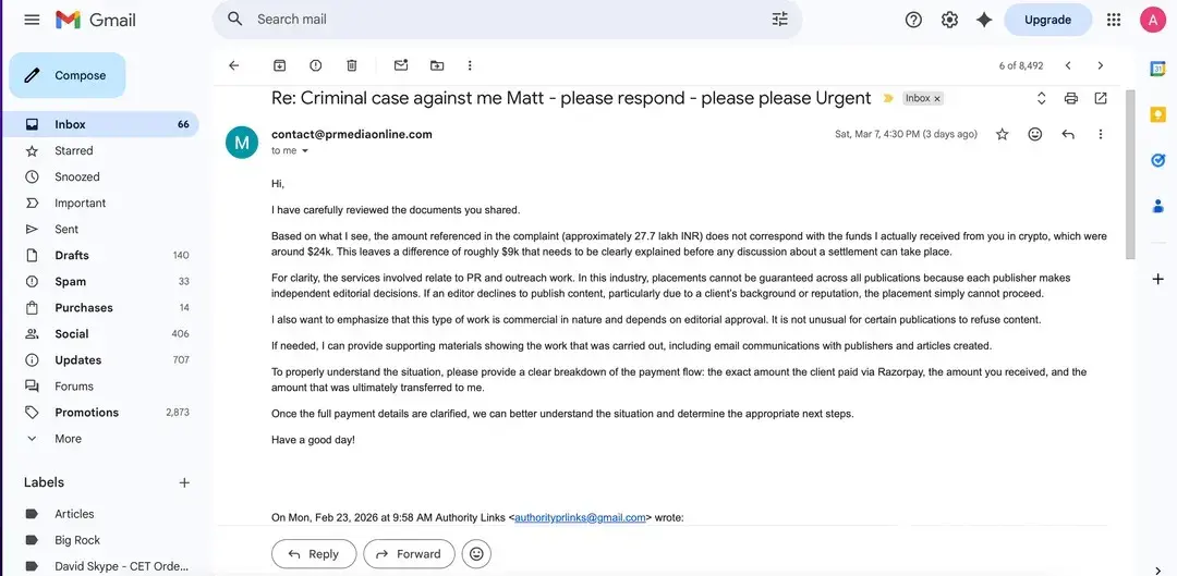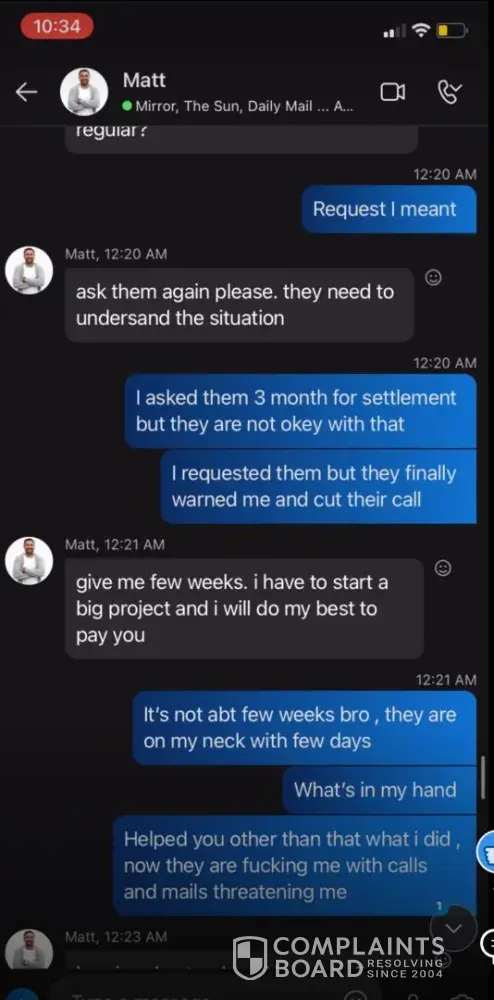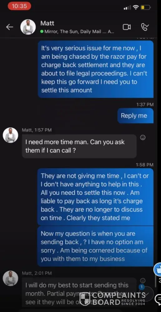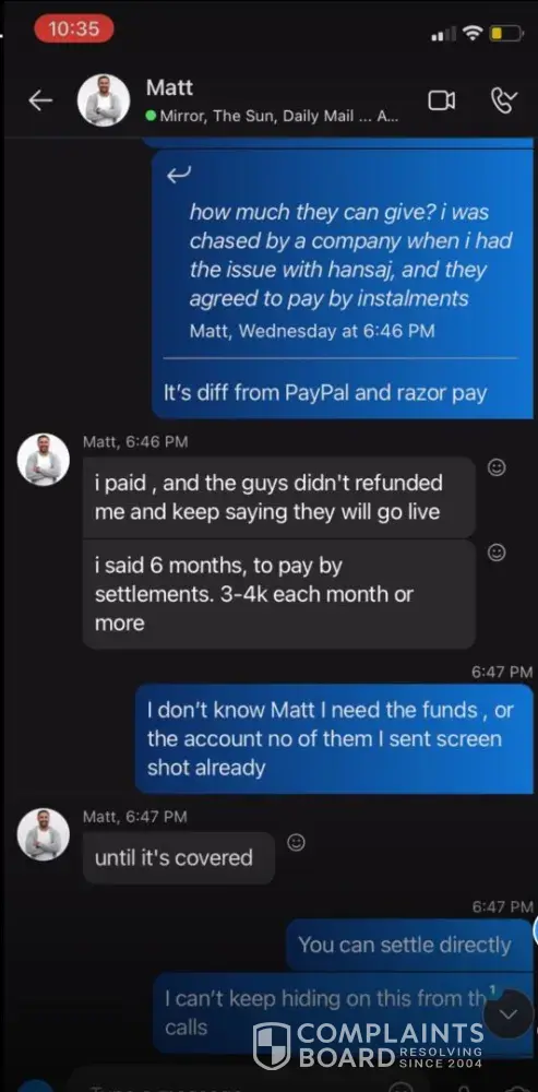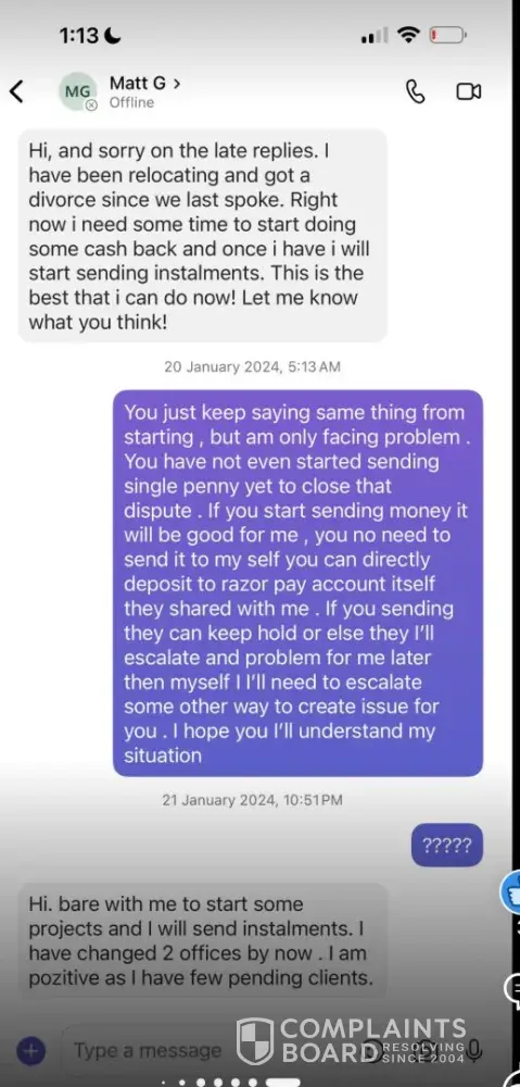 Over time, the communication became inconsistent, and responsibility has been disputed or shifted, which has made resolution difficult. I have retained all relevant evidence, including payment records, transaction confirmations, and written communications acknowledging receipt and discussions of repayment.