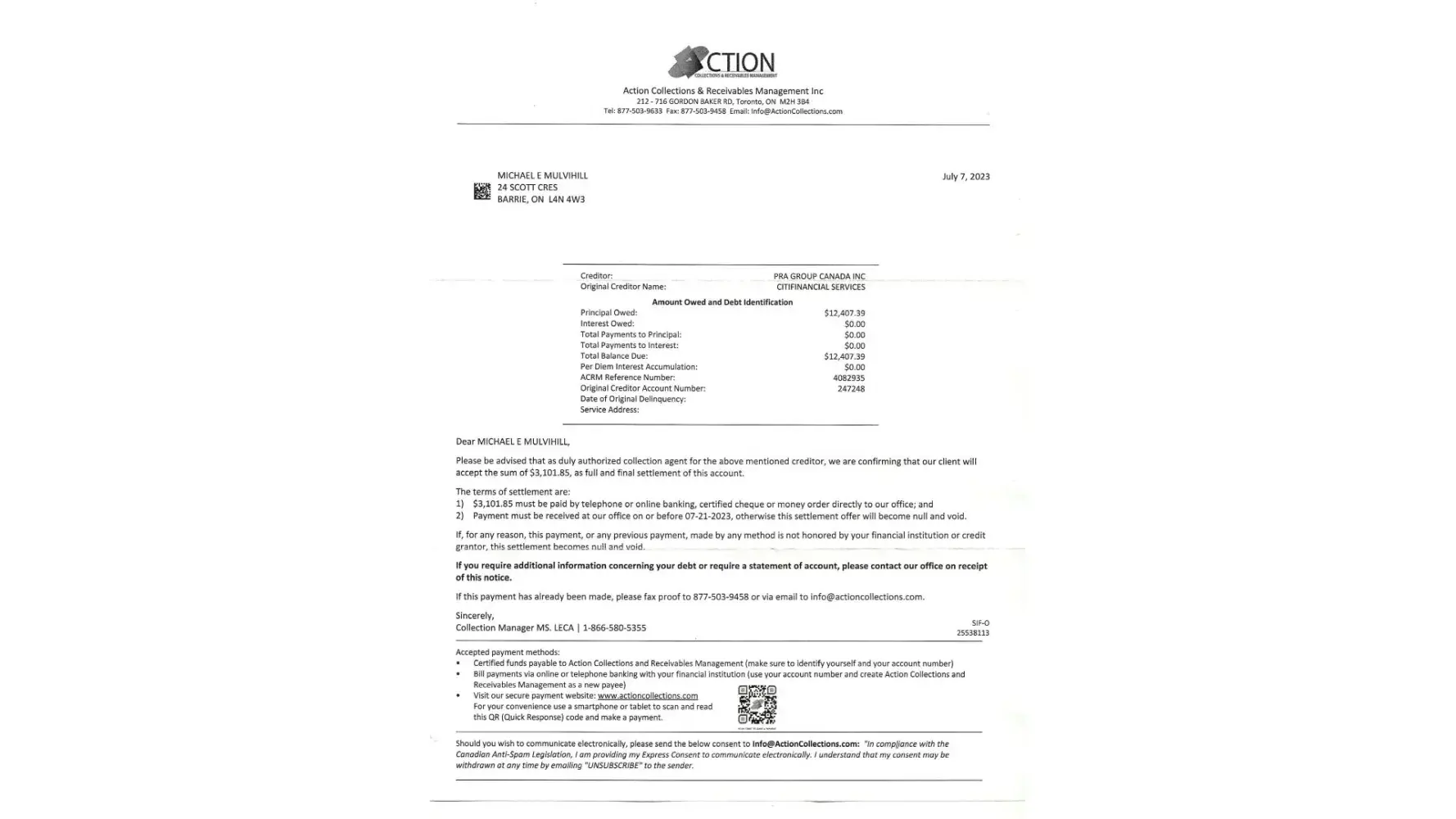 This shady company has been calling for months from several different numbers leaving as well as another associated with them leaving a voice-mail for my husband. Today July 14th,2023 we received letters with two different middle initial (he has 3 middle names) requesting repayment of debts to two different companies. One over 12K to Citi Financial Services and one over 700 to TD Canada Trust. We have been married since 2005 and together since 2003 and NEVER has my husband dealt with either institution. There was no details in the letters of how the debt occurred, what it was for, why that amount etc.