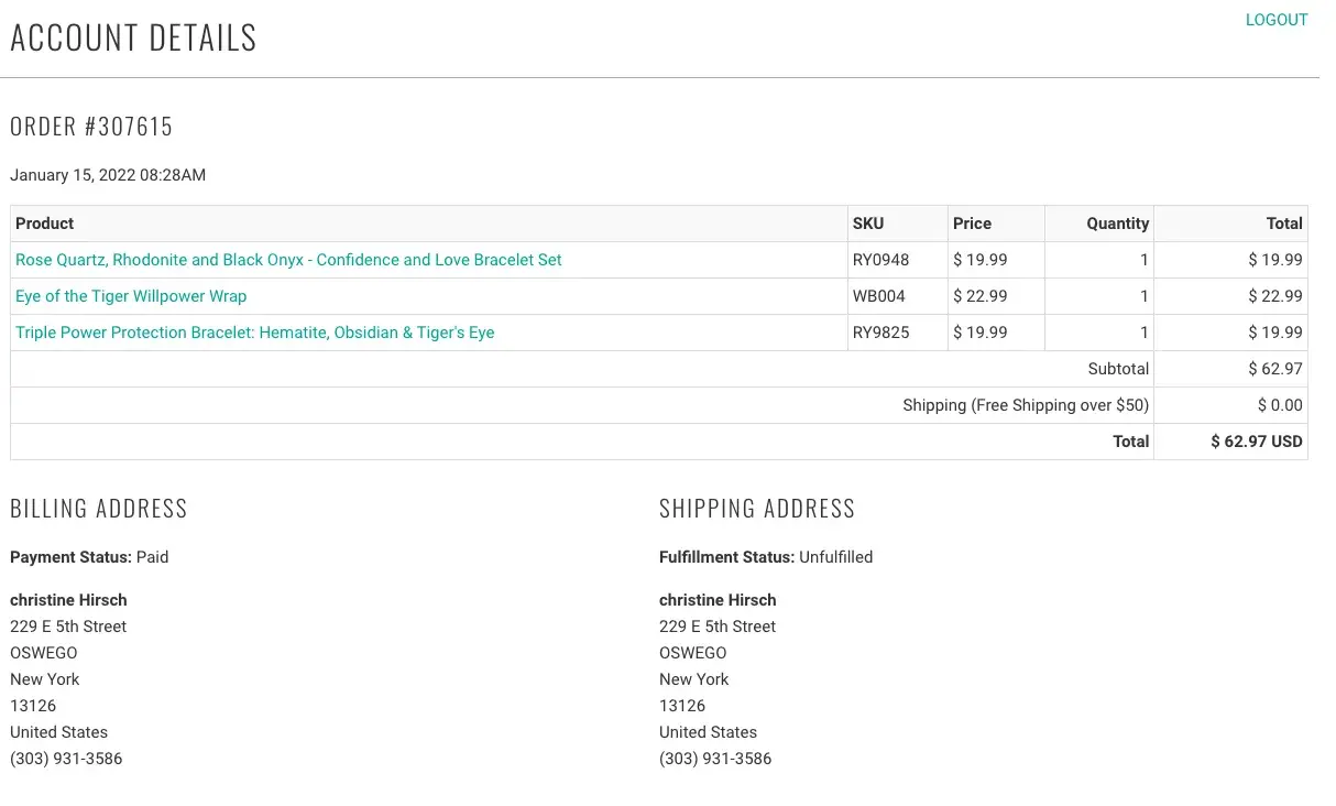 Purchased 3 bracelets on 1/16/22 received an apology email on 1/26 stating they were behind in shipping but, offered no future shipping date. My credit card was charged the same day. I have emailed at least 3 times and callled the bogus number they provided. Please if you have not placed an order do not buy from this company. if you have not received your products or a refund please file complaints at (1) Better Business Bureau even though they have not responded to them (BBB) it is important to have your experince documented. (2) You can also file with the Attorney General's Office of PA. I am baffled at how a company can take your money and think it is okay not to deliver the products you paid for in advance. And, not respond to you when you ask - when will I receive my product?!