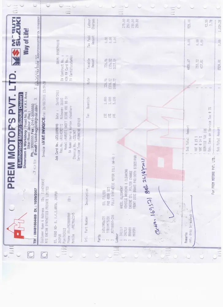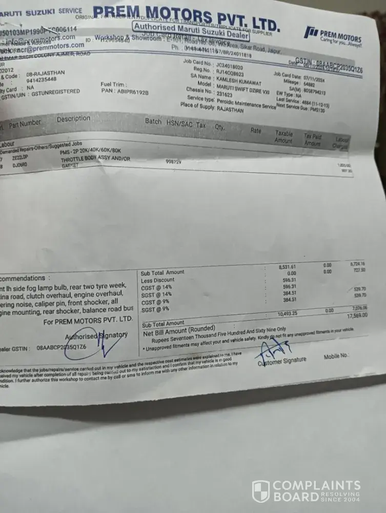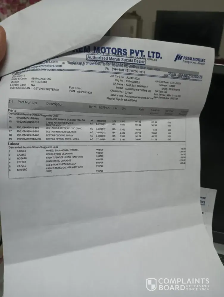 Shri prakash kumawat, 31.01.2025 general manager, prem motors, maruti suzuku ltd. Reg-car maruti dzire rj14cq8623 ref-job card no. Jc24020161 (sa-kamlesh kumawat) dear sir, with ref above I want to bring in your notice as under- 1. My car was dropped at prem motors road no 8, vkia, sikar road, jaipur for servicing on 07.112024 vide job card no...