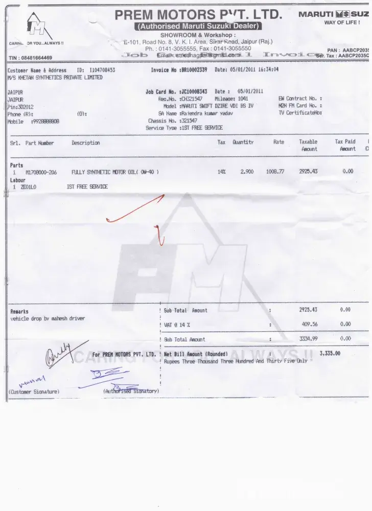 i got changed engine oil on my first service of my car on 05/01/2011, that time the km of the car was 1041 kms.through the bill no. BR10002339 dated 05/01/2011