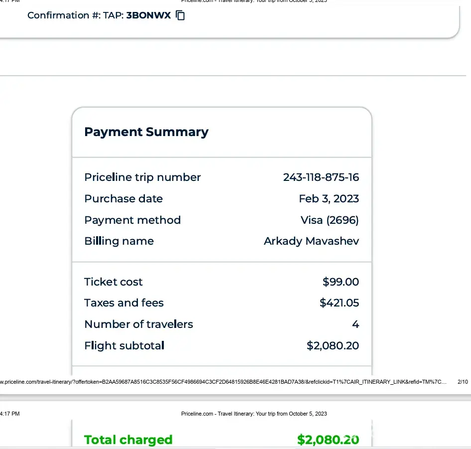 I bought 4 airplane tickets on 2/3/2023 through Priceline.com to get to Seville, Spain from JFK for Arkady Mavashev, Rena Mavashev, Mark Shakarov, Bela Shakarov, and got confirmation and ticket numbers from Priceline (Priceline confirmation is attached).