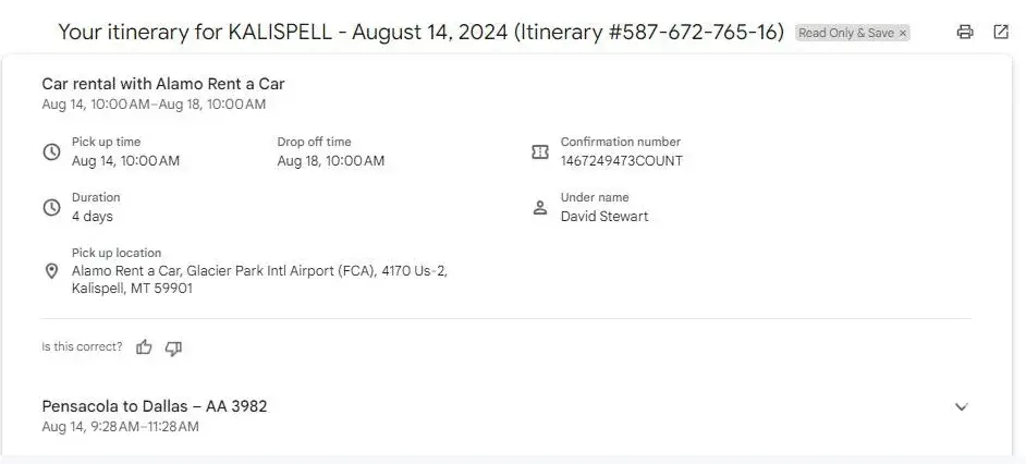 I had made reservations recently on July 6th, 2024, through Priceline to travel from Pensacola, Florida, to Kalispell, Montana on August 14-18, 2024.