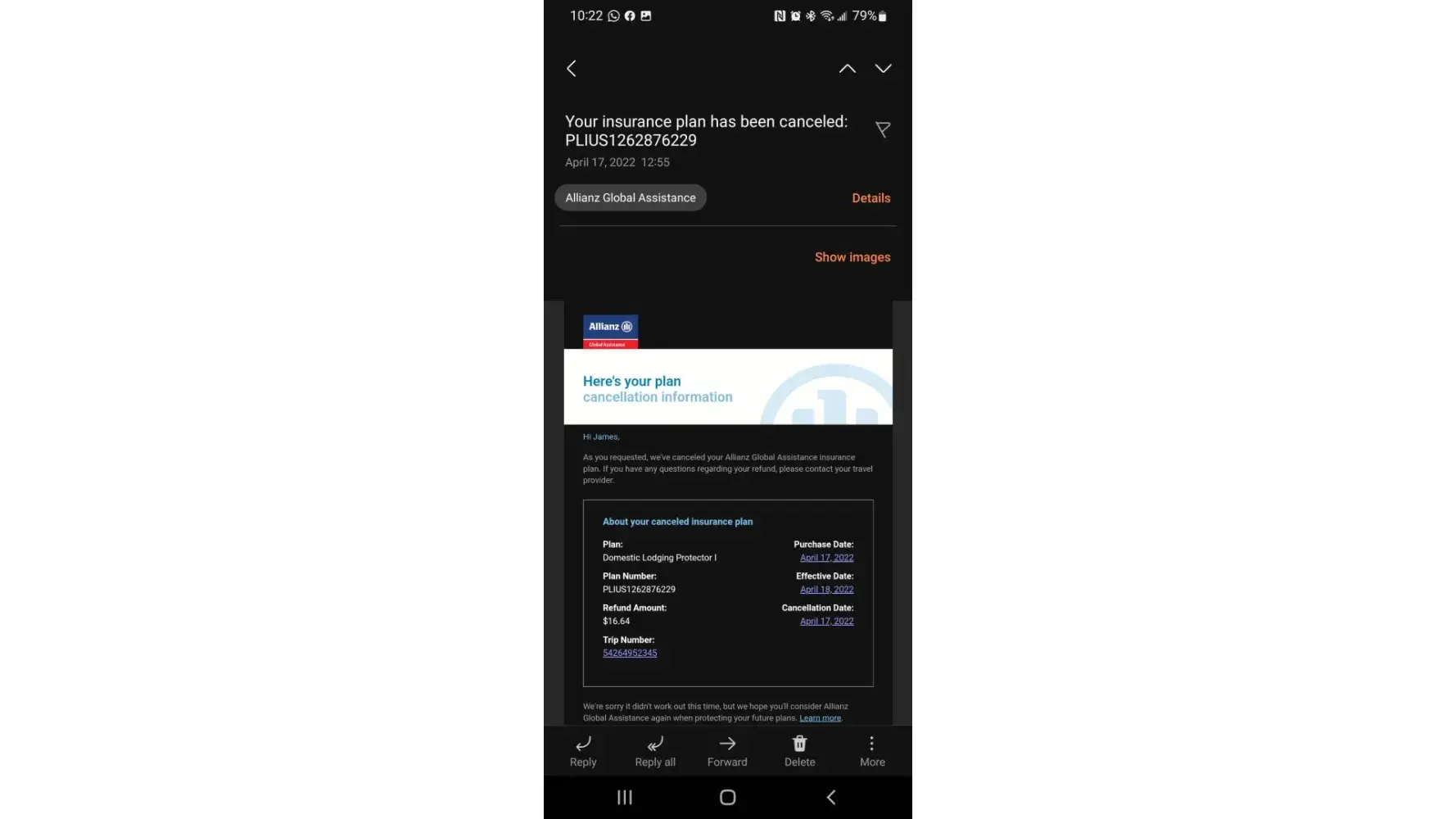 4/17/22 I accidentally booked hotel reservation for trip October 28-31st. I called immediately after trip was submitted. Trip was cancelled within 5-10 minutes of booking way under 24 hours. Received trip email along with travel trip protection email. Spoke with supervisor trip cancelled. I was supposed to receive full refund on trip including trip protection $734 and change. However trip protection (per Allianz) protection plan was active as of April 18th. Received email days later that refund amount changed to $700.80 excluding protection plans. Called back a week later and agent submitted resolution. I was supposed to get a email response with resolution which never happened. This is very upsetting. Called again was told supervisor was on a call and would call me back. Im still waiting. I have called 2 times and no resolution. This is unprofessional.