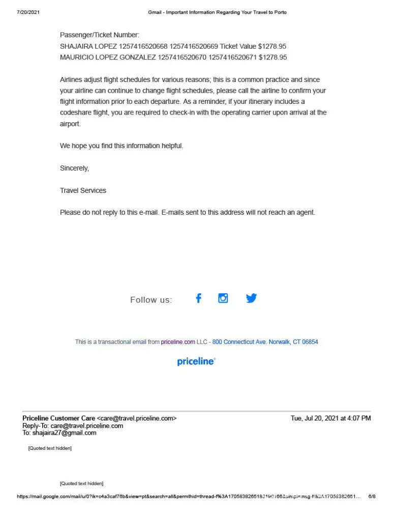 Today is 7/27/2021 at 8:08A (spent some times this morning drafting this message). I have NOT received any form of communication from Priceline. My trip is next week and hotel rooms have more than doubled in many cases now. But more importantly m, we have 13 traveling and we all booked the same hotel.