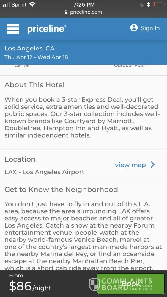 I booked an express deal hotel with Priceline. It was advertised as being a 3 star hotel similar to Courtyard of Hyatt. The website says that I should expect solid service, extra amenities, and well decorated common areas. Yet, when I book the hotel and go to the companies website the reviews tell a different story. Their are complaints about broken toilets, leaky roofs, poor housekeeping, even theft. I don't feel comfortable staying at the hotel and feel that I was deceived.