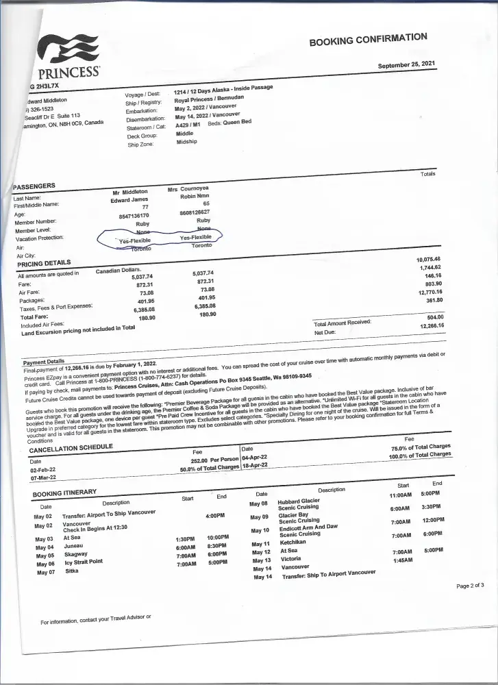 my name is Edward Middleton and my cancelled booking # 2H3L7X which I cancelled along with EZ air and the are refunding me of the $2, 248.62 paid only $1460.04 A fee of $788.58 was for the Ez Air which they claimed was not flexible air however my booking shows Flexible Air. I have talked to customer service 3 times and put on hold and eventually cut off. I have sent copies to Princess with nob response.