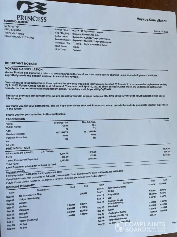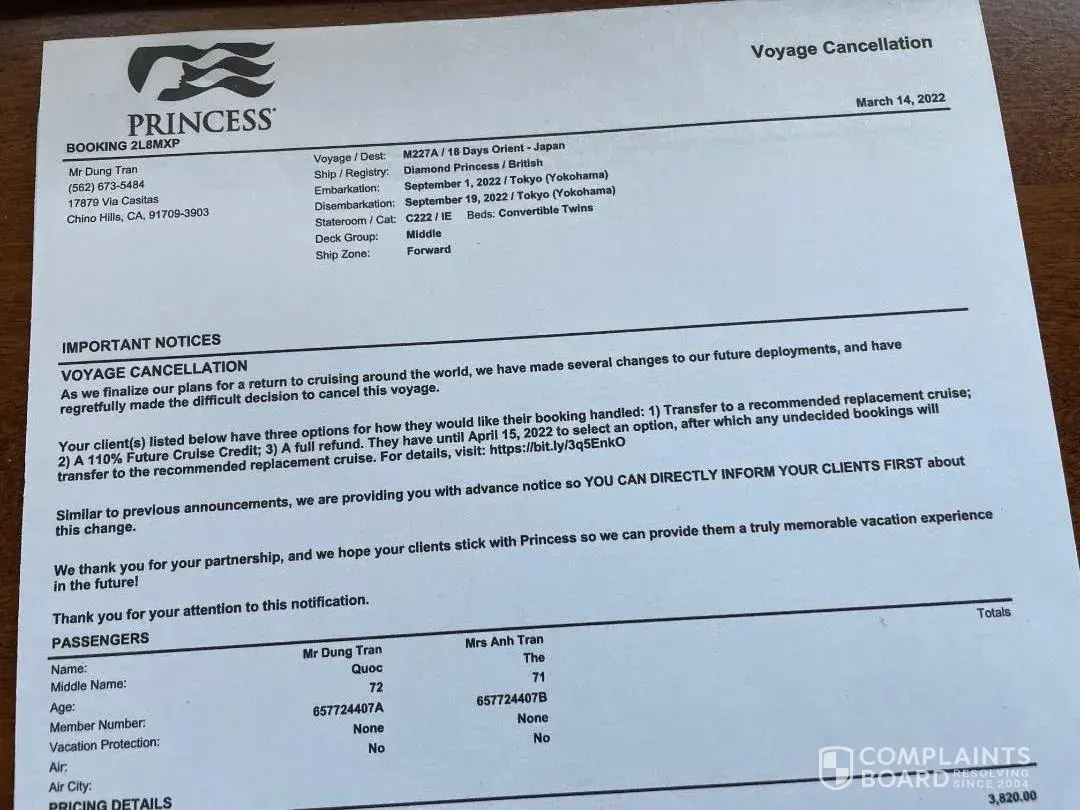 Booking 3P8T2W (M307A 17 days Souththeast Asia) has been cancelled & Princess send us a letter (see attached copy) giving us only two options: 1) A 100% future cruise credit. 3) A full refund. We have until April 15 to select an option. When we call [protected] request to working on a replacement cruise or equivalent cruise, Princess denied with a simple reason: These options are not for Casino booking. We only have a refund option.