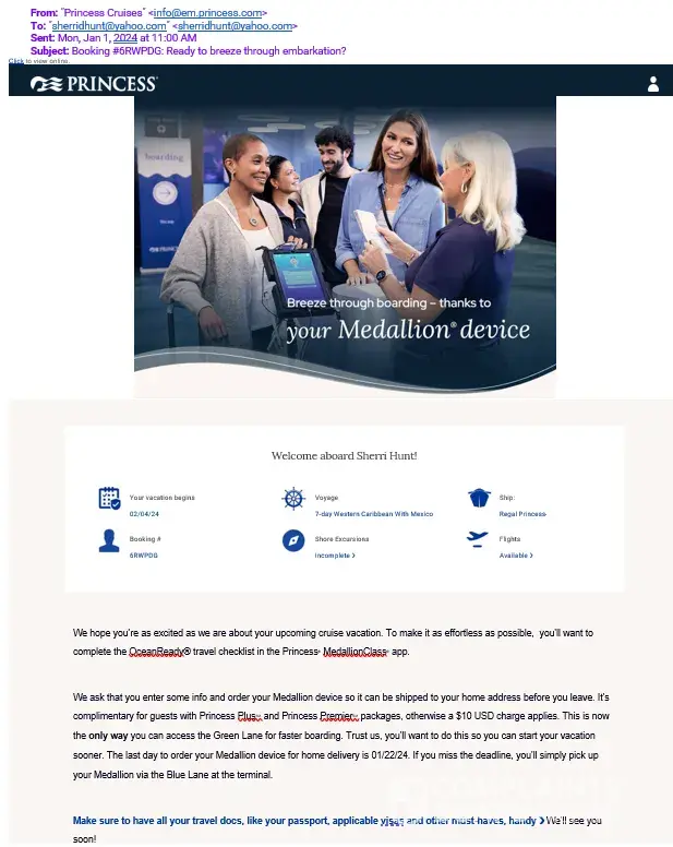 I was sent an email that stated I needed to order my medallion by 1/22/2024. It is now 1/22/2024 and they are telling me that I was supposed to order it by yesterday which is a contradiction to the email which I relied on as accurate. This is our first time sailing with Princess and this is not a good situation to start a relationship off with.