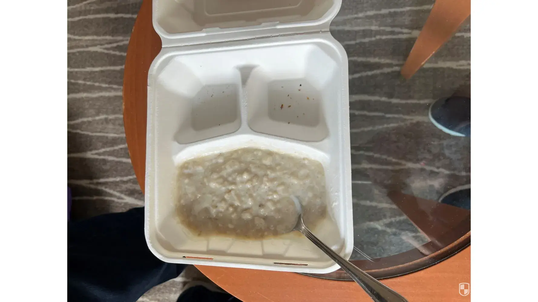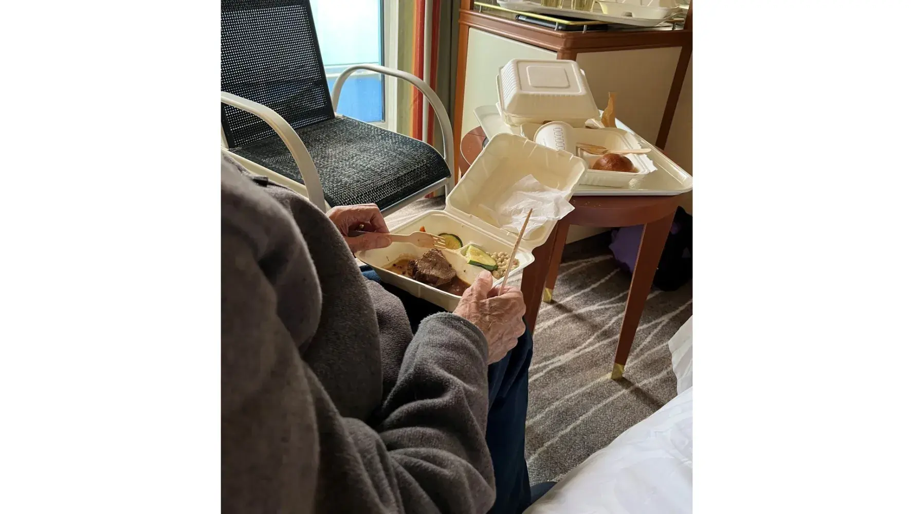 The next six days were just awful! The food took hours to order, endlessly listening to recorded messages as nobody answered the calls. On one of the days, I rang for breakfast from just before 8.00am and finally got through to someone to take our order at 11.00am! When the food arrived in cardboard containers with wooden cutlery it was cold and unappetising. Often the food we tried to order including most cereals was unavailable. We did get Porridge for breakfast but with no fresh fruit available except whole red apples. Orange juice unobtainable! Curled up sandwiches for lunch. Nowhere to eat (to both sit, we had to bring the balcony chair into the cabin).