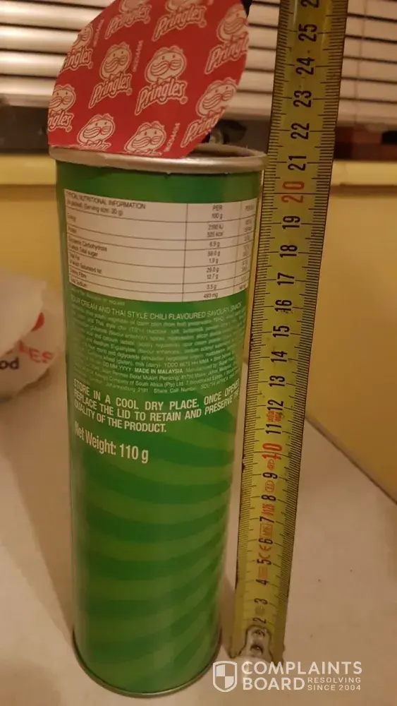I have just purchased a 110g can of Pringles. I get home so excited to eat them as I've been craving them for a week. I then open it only to get very disappointed to find that I have only got half a can of chips. I would like to be reimbursed for this. There is no way a half can of Pringles can cost R20.00. Not in this economy. I am very disappointed by this.