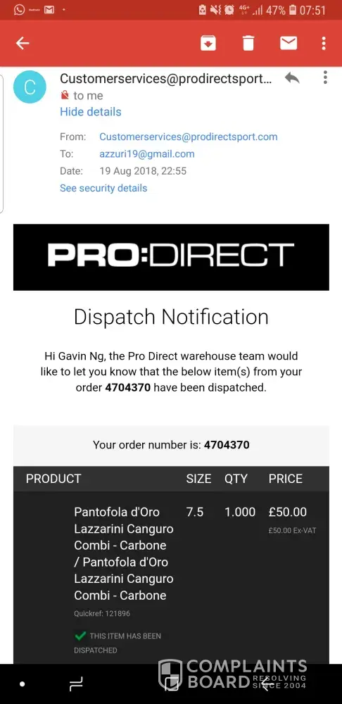 This wld probably be the last time i am sending a message to you guys. I placed an order for a pair of Pantofola soccer boots online on 19 Aug 2018 Sunday and got an email from Pro Direct that the item had been despatched. However, I have not had any response from Pro Direct despite sending several emails and calling your customer service hotline multiple times regarding the whereabouts of my goods. Worst of all, I have not received my goods till date, not even a tracking number. All the website has been showing since 19 Aug was that "Carriage to be confirmed". It was indeed appalling that a big company like yours have such poor or zero response despite your good effort in marketing sports porducts online. It is very costly to call UK from Singapore and I was put on hold for nearly 15min every time I called and no one bothered to pick up the phone. It has never been like this several years ago when I ordered 2 pairs of shoes and it arrived promptly without having to chase PDS for it.