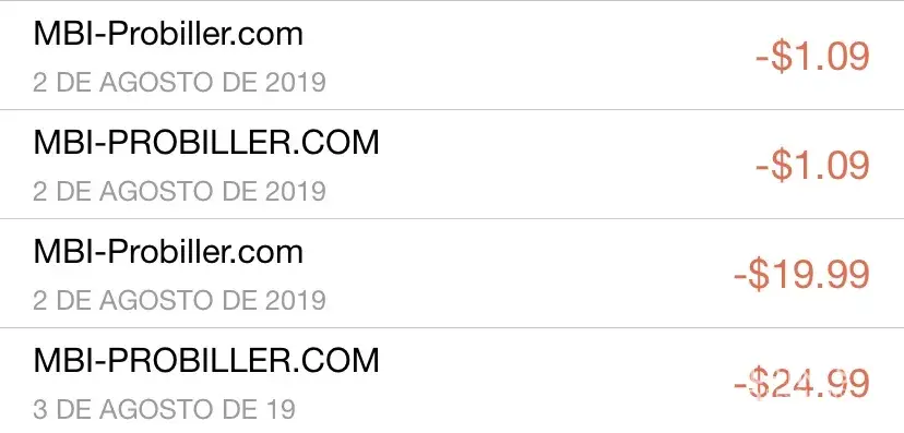 I have several deductions in my account that I did not approve of starting from June 28, 2019 with 3 different $1.00 transactions, then on June 30 for a $1.00, July 1 for $1.00 and $39.99, July 2 for two of $34.97 and they all are coming from MIB Probiller.com I want my money back to my account and whatever this is to stop if not I will contact my lawyers! I have sent in pictures of my bank statement to show you the days as well .. I do not know what this is and I did not authorize these payments either! Thank you and you can teach me at Ana.[protected]@icloud.com!
