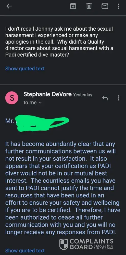Stephanie DeVore told me that "PADI cannot justify the time and resources" and she also said "Therefore, I have been authorized to cease all further communication with you and you will no longer receive any responses from PADI." This sounds a lot like she doesn't want to spend any time responding the me about sexual harassment complaint and poor training complaint or make things right.
