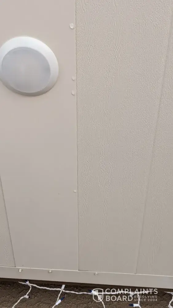 2) Now we have visible paint on our walls where they tried to grind down the glue and spray paint over it to fix the mistake. We also have wall "caps" standing up along the back wall to hide the glue. We don't want them. It was the only choice we had to hide the damage.