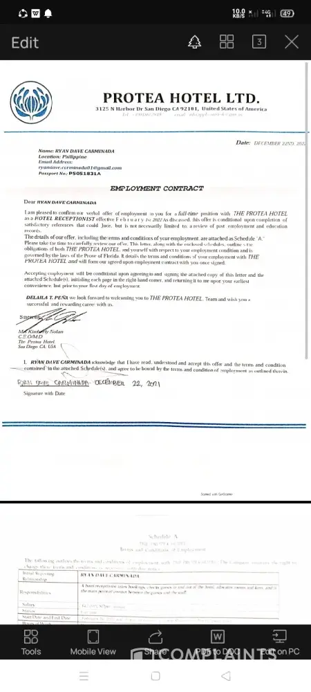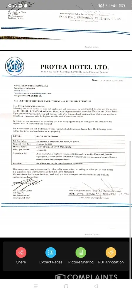 Hi, my name is ryan dave carminada, i am validating the employment contract given to me by PROTEA HOTEL under this email(info.[protected]@gmx.us)i am wishing if you can respond me to soonest possible time.i want to hear if the mail was a scam or not?