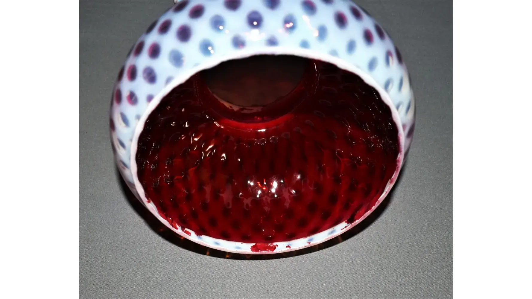 Won items at online auction from Young's Consignment Center, Canton Ohio and the most expensive was described as: Lot #37 "Rare antique Fenton student lamp" - one picture. The shades are rare but not what they appeared. They were cranberry opalescent shades but in reality they were Fenton white opalescent that was painted red on the inside. When I returned home and washed all the glass I purchased the "cranberry started to flake". It was obvious that the shades had been painted.