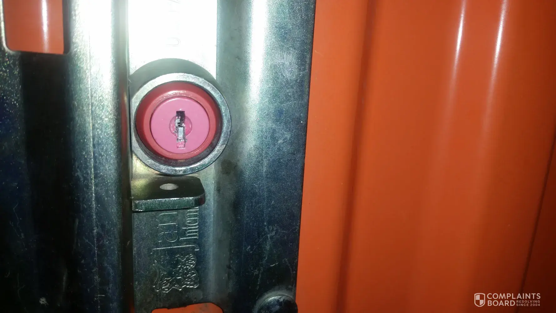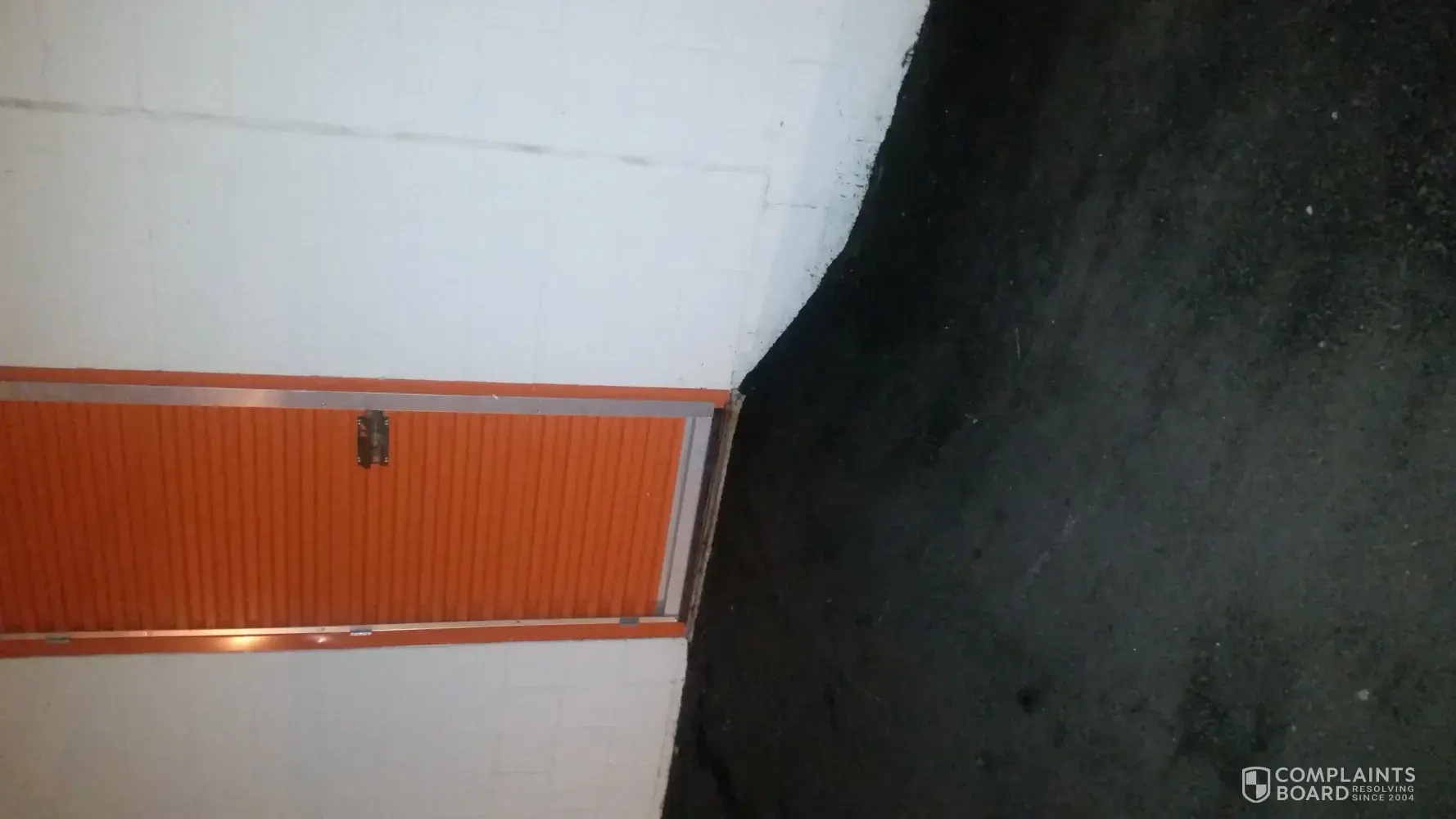 On July 16th we had trouble opening our lock. It took several tries but when we finally got it opened the door wouldn't lift up and realized that the top part of the door had been bashed in and out of the track.