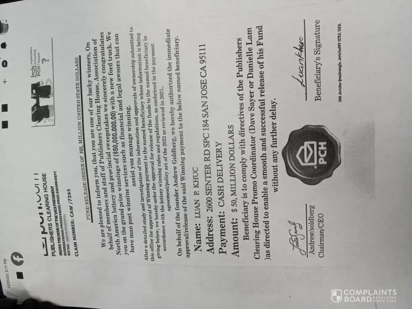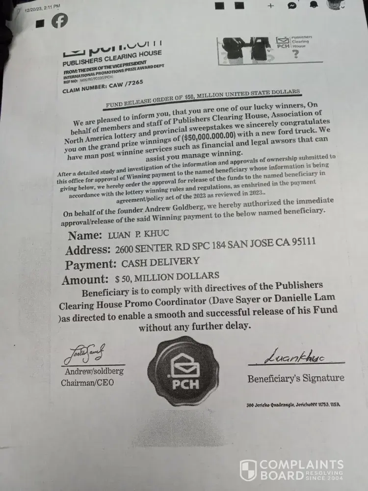 i am LUAN P KHUC and house address 2600 SENTER RD SPC 184 SAN JOSE CA 95111 i did win the prize the amount $50,000,000.00 back in 2023 and the CEO of PCH name Andrew Goldberg I have a document from PCH sweepstakes from them issue for to claim in 2023