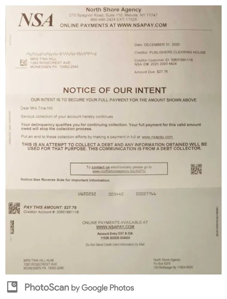North shore agency is trying to collection money on behalf of publishers clearing house from me