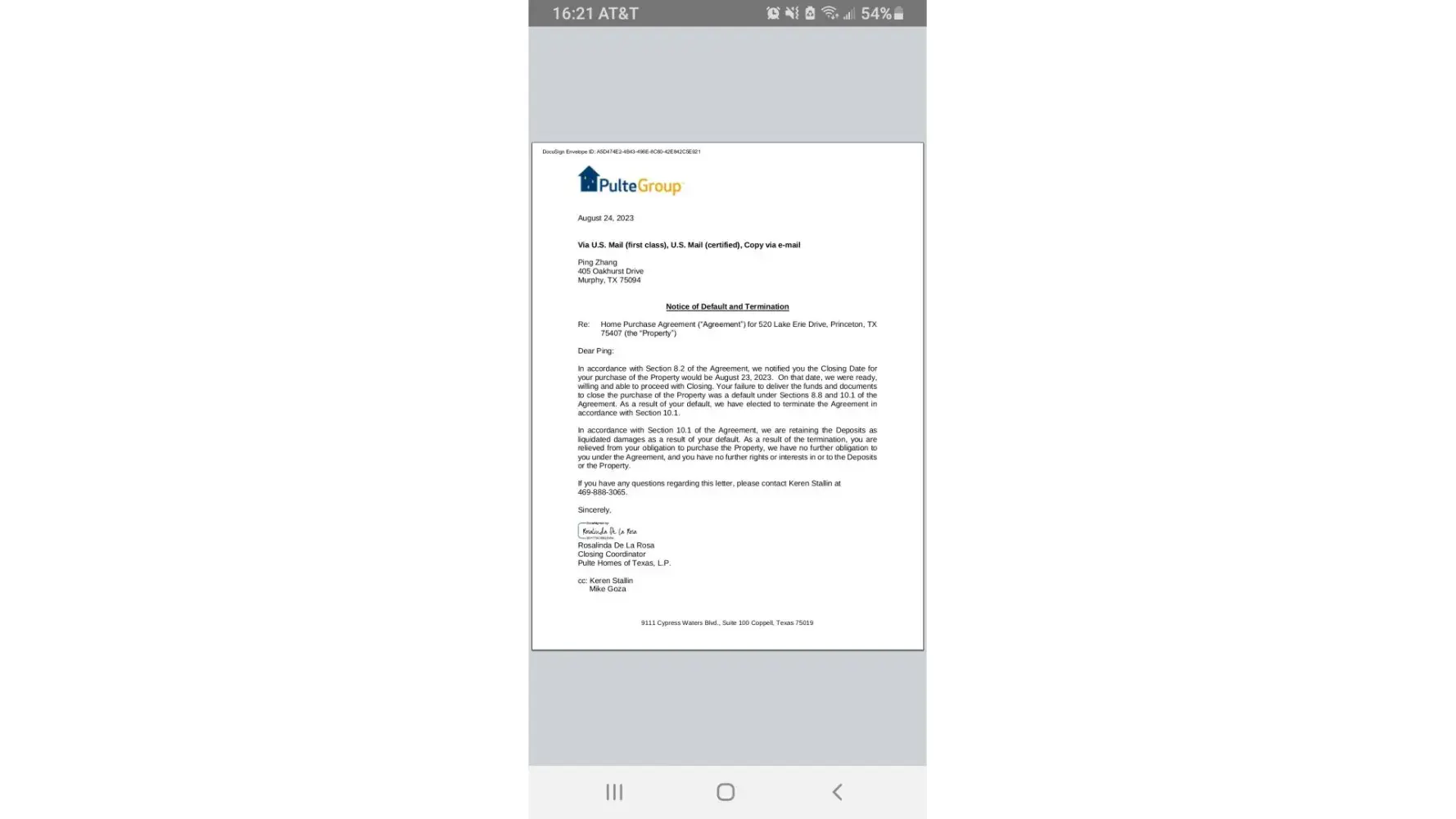 I will not be signing this termination agreement as I did not initiate this. Pulte Mortgage declined my loan!