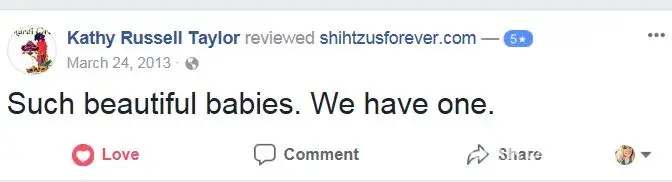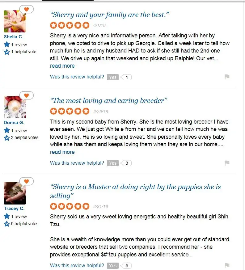 We have purchased two babies from Sherri and I have had 4 other Shih tzu's but I was impressed with her knowledge of the Shih tzu bread and the care she took with her babies. Two of my children also purchased puppies and they will not go anywhere else for future puppies.