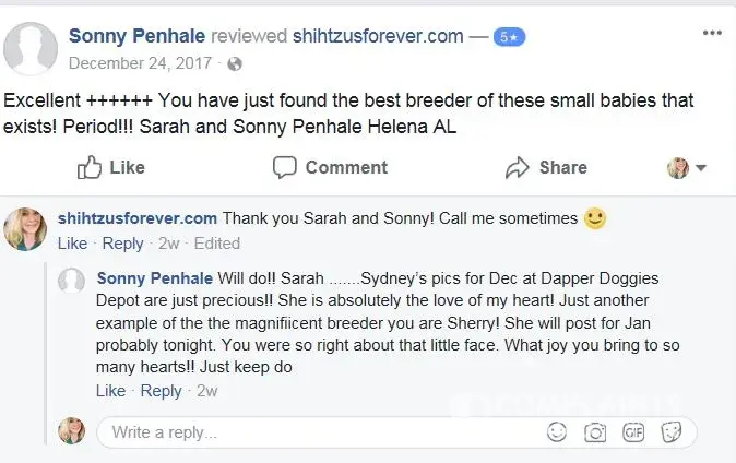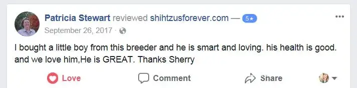 We have bought two Shih tuz pups from this breeder Sherry ! We can not say enough of good things about her and her pups . The care that she gives her dogs is just as you would take care of your fur babies ! They both came to us three months apart one was born in July 2016 that we brought home in October, our other bundle of joy was born in October 2016 and we brought home in January 2017! They came to us spayed, shots up to date, dewormed, dew claws removed and the grooming was perfect they both were so clean ! She gives you the best instructions and care guide that will teach you so much, has them on the best food possible not to mention that they come potty trained ! The Love she has for her dogs are beyond any breeder I have ever met . Our fur babies are now 9 months and 6 months and we can not express how wonderful both are Beautiful, Healthy, Smart and so Lovable ! We are so so in Love with the joy they have given us ! We would go back to her and definitely recommend her to anyone ! Thank You Sherry you are the best