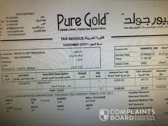I was assured by your representative that I will be emailed an invoice on my email address which I provided but it is very un-professional that I have not been sent any invoice and hence proof of my purchase and weight of 1tola bracelet which I paid using my UK Halifax debit card ( worth £ 10555 pounds = 4999 AED . I requested twice and even went back to the store at the airport, but was assured that I will be emailed the said receipt. I could not go back the third time as my flight had to leave ! I have been scammed and I want a refund. I have been charged nearly double !