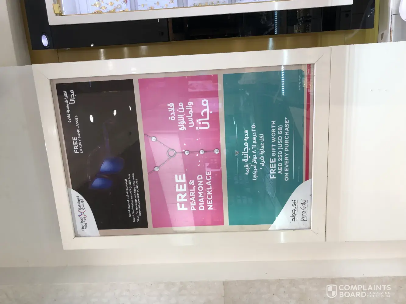 I purchased a ring on 05th October, and noticed after I parted with the payment, that there was an offer advertised for free pearl necklace, and 250 dirham voucher with your purchase. I was told when I queried this that the 250 credit was only with gold purchases, and the only pearl necklace they could offer was a damaged one, to which I declined. I requested a refund of the 250 Durham, as it did not specify this was only with gold purchases, and they could not offer me a necklace.
