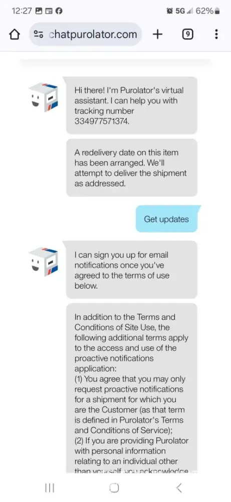 I called Purolator to put in a complaint and was told that it would be a 45 minute wait and would I like a call back.