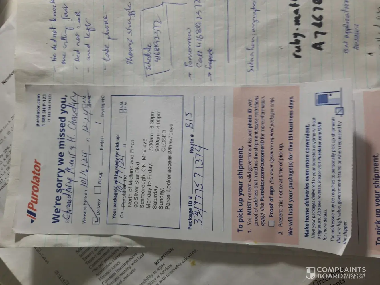 The route number is 4N2 (indicated on the notice. We are at a loss as to what to do except to refuse to use purolator in the future when given the option.