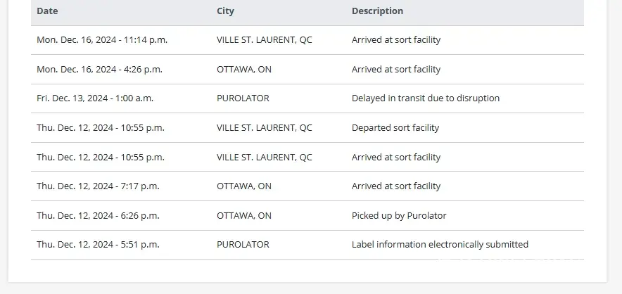Out of 5 different items I've had shipped to me, only one arrived on time. - Three of those were around Christmastime, so Canada Post shares some of the blame - but since Purolator is owned by CP, it comes down to a snake eating its own tail. Also, the ONE that did show up on time came from Burnaby B.C... and I live across the Fraser River in North Delta, B.C. - LESS than 20km away. My most recent package was sent on Friday March 28, 2025. Allowing for "ONE BUSINESS DAY" would dictate arrival Today (Monday March 31, 2025) - which, according to tracking info WAS the estimated date of delivery. Unfortunately, it didn't leave the sorting facility IN ONTARIO until 5:24PM EST (2:24PM PST here in B.C.). I find it extremely unlikely it will arrive today. The Canada Post strike and Christmastime high volume may have explained some delays, but in no way made it acceptable. Now they don't even have that excuse to hide behind. The bottom line is this: charging for a service they can't deliver on is unacceptable business practice if its due to incompetence, ... and outright Theft if it's intentional.