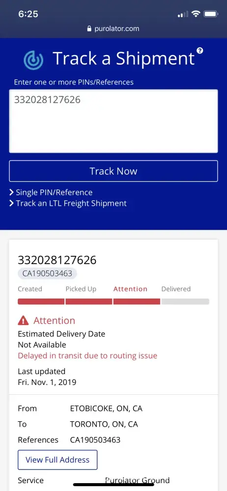 It is now November 5th, the tracking info continues to display the routing error message, I have no package, I did call the manager back and left a voicemail asking for him to call me back and let me know what's going on with my shipment and I have heard nothing back. I'd like to add that a few weeks ago I ordered a tv from bestbuy that Purolator was supposed to deliver and had the same issue where the package was misrouted and I had to drive 35 minutes to retrieve a 55 inch tv, so the above isn't a one off. I have included all relevant information in the photos.