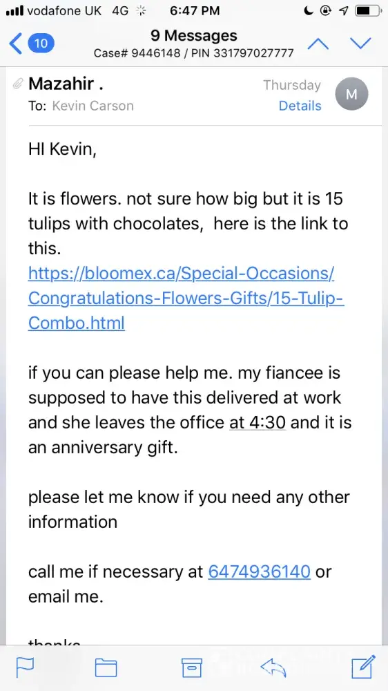 I had ordered flowers with the company Bloomex as a surprise to send to my fiance at her place of work. The flowers were meant to be delivered on April 18th however on the 18th the only thing I could see the entire day was that it was at the sorting facility on the 17th. I decided to call Purolator and they had a tracking specialist look into it. They were communicating with me via email and asked me for details of what the product looks like. I had sent them the exact link to the product so they definitely knew they were flowers. I even explained to them that they were a surprise for my fiance and that they are being sent to her work (so a business). They explained they were looking into it and at the time the communication seemed to be open. Today (April 22nd and also Easter Monday) I receive an email saying that my package is on its way to being delivered. I also get an email from the tracking specialist saying the same thing. I replied to the specialist reminding them that it is Easter Monday and that they are sending the package to a business. Also, my fiance does not work on holidays which is why i asked for the flowers to be delivered on Thursday. I do understand that there are many packages that Purolator receives however I do not understand how they were communicating to me via email and yet they could not ask if it was a convenient time to deliver the package. They had no problem emailing me and I replied very quickly, yet they just assumed they can send it to a business on Easter Monday and expect the staff to be there? Everyone in the email thread knew of the situation because I had specified it. If it was a regular business day then I understand why just sending it out would be a good idea. They also knew it was flowers so I'm not sure why they would assume that throwing it on a truck and delivering in on a holiday to a business would be anything close to satisfactory to anybody on the planet. I would rather someone throw garbage at me. The end result is that my fiance was not at work and will not be at work for another few days as she had taken time off after. She now has a bunch of dead flowers waiting for her on her desk in a box upon her return. I replied to the specialist saying it is a holiday and she offered me the choice of disposing of the package. Wouldn't it have been slightly more proactive to ask me before sending it on a truck and delivering it on a holiday and assuming it will be received? I will be attaching copies of the emails between myself and the tracking specialists. As far as compensation, I would suggest some sort of credit as this is just horrible. Instead of getting some flowers at work, she will get dead flowers at her desk. I understand the flowers are not your problem since Purolator is just supposed to deliver the package. I fully get that. My issue is that the specialists were aware of the situation. At this point, any other solution would have been better than throwing the flowers on a truck. How does anyone assume that someone will be available at work on a holiday? I suggested that they can deliver it to a different address so that my fiance will actually receive the package to which they replied that they cannot change the address once it is on a truck. Who told them to put it on the truck? This is a really ruined sentimental experience for me thanks to poor customer service.