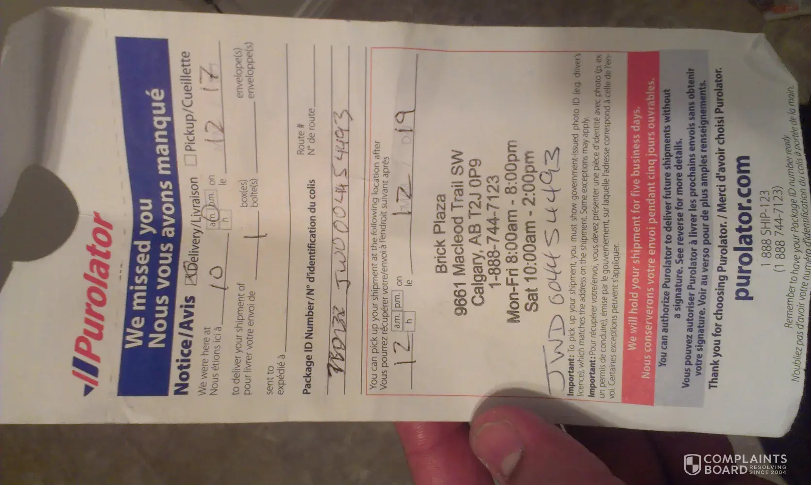 I waited at home all day today knowing my package would be delivered. I seen the Purolator truck drive by and just assumed he would be turning around since I did not see him stop. I looked out and notice that a note was hanging out the mailbox which stated that they "missed us" and where I could pick it up. Confused because I was in the next room and did not hear the doorbell or a knock was convinced that the delivery personel did not try to get our attention. I called Purolator and they said if possible the driver would turn around and come back. I continued to wait around all day on the main floor of my house by the door and did not hear a thing, but looking out again I noticed another note on the door this time it was written that he "rang and knocked 2x" which I find hard to believe since myself along with my roommates did not hear a thing (and yes we checked that our doorbell works). I finally drove out to the Purolator building which is half an hour away from my place and they would not give the package to me because my ID has my hometown address on it on the address for the place I am renting. I only fully read the notice that was left on my door where it does state that my ID must have the mailing address on it, after the worker told me with a condescending tone that it was "clearly stated and highlighted" (I do realize this was my fault but her tone was very much not appreciated). I sure hope tomorrow I receive the package and am not forced to make the half an hour drive back out there for the second time.