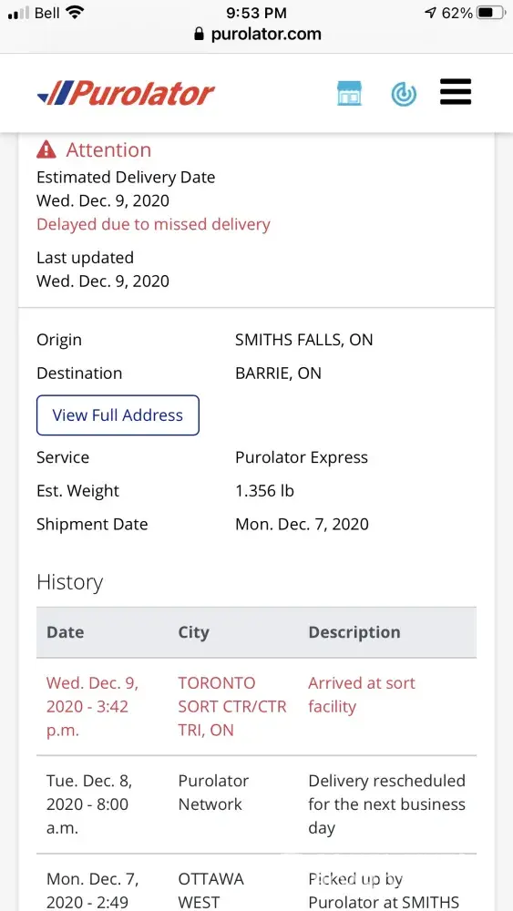 I concur with the complaint above. I paid extra to have you deliver in 2 days which should have been yesterday and first it said “delayed due to missed delivery” on Dec 8 and rescheduled for Dec 9. Then at 3:42pm today December 9 it was sent back to Toronto. I live in Barrie so now I’m At least 4 days if it arrives tomorrow. This is ridiculous. I paid extra for delivery.