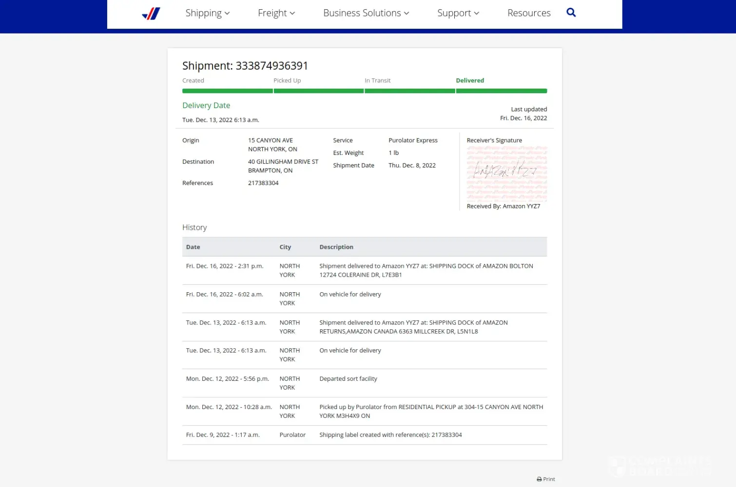 It is now Oct. 26, a month since an unknown 80lb box was delivered to my residence on Sept. 28th and taking up space in my garage. You sent an on-line request on Oct. 3 to your Purolator delivery depot in our Simcoe County region ref. # [protected] to contact me and schedule a redirect delivery to original owner/purchaser. I have NOT heard from Purolator, complete silence. I understand that this is not Purolator’s fault. The shipping address provided by the original on-line purchaser, Anna Santos of a unknown address and frankly does she even exist you delivery truck to my house, there is NOT such an address in Wasaga Beach as 23 Lamont Aveneu (incorrect spelling of Avenue).