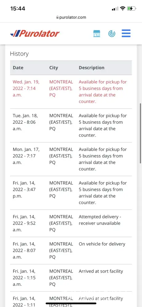 I have a package that was supposed to be delivered last Friday, the driver did not even stop at my home or buzz my apartment, I was home and waiting for the package the entire day. I contacted Purolator immediately after the tracking updating to ‘received unavailable', as I was available, the driver did not come to my place. I requested redelivery and was advised it would be delivered Tuesday. Since Friday the package has just said ‘ Available for pickup for 5 business days from arrival date at the counter.' This is all it has said every day, despite my request for redelivery. I would be happy to pick it up but they took the package to a place that's a 30 minute drive from me! There are a dozen places within 10 minutes of my location, I can not get out to somewhere half an hour away from me. I have contacted Purolator three times and been told ‘the request is in process but there's a delay at that location so the request can take 3 days or more'. When I asked if the package would be returned if I didn't pick it up before the 5 days, if the request wasn't processed by then, the best answer I got was ‘not necessarily'. That is absolutely no help and I am furious with this complete lack of competence. I will never use this horrible company that has you wait on hold for 37 minutes only to say ‘well it should be delivered, it won't necessarily be returned'. Absolutely the worst service I've ever received from any shipping company ever.