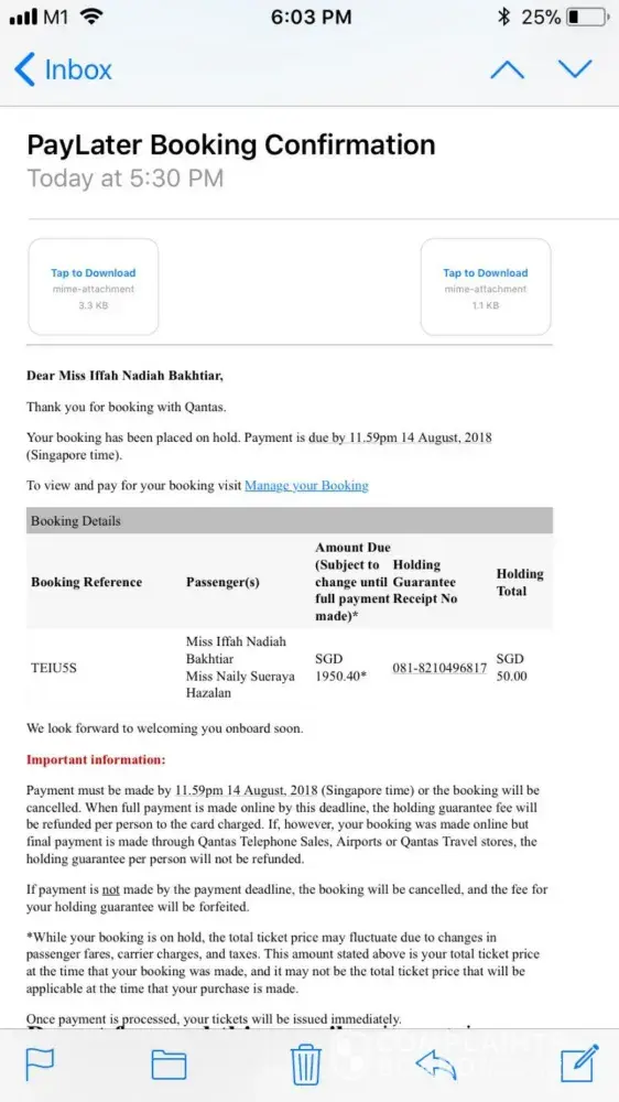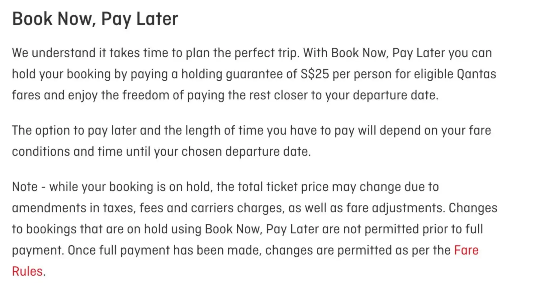We have decided to take up this option as our travelling date would be in early December ie exact date 12 December 2018. We were totally impressed with the option provided by Qantas and in the terms and condition mentioned that you can pay a holding guarantee of SGD25 per person for eligible Qantas fares and enjoy the freedom of paying the rest closer to your departure date.