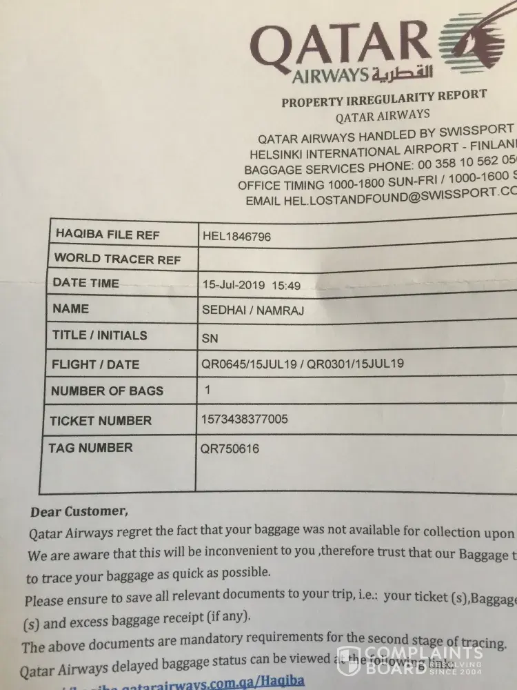 I was traveling from Nepal to Finland on 15 July. When I landed at Helsinki, my luggage was not there and I contacted costumer care and they gave me a lost and found report.