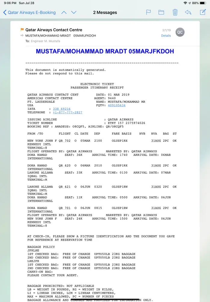 Hi! My name is Mohammad Zaka-ul Mustafa. I am Qatar Airways' ‘Privilege Club' since 01 April 2011. I traveled to Pakistan from New York, on 05 March 2019 and came back on 06 June 2019. On my way back to New York following items have been stolen from my baggage :
