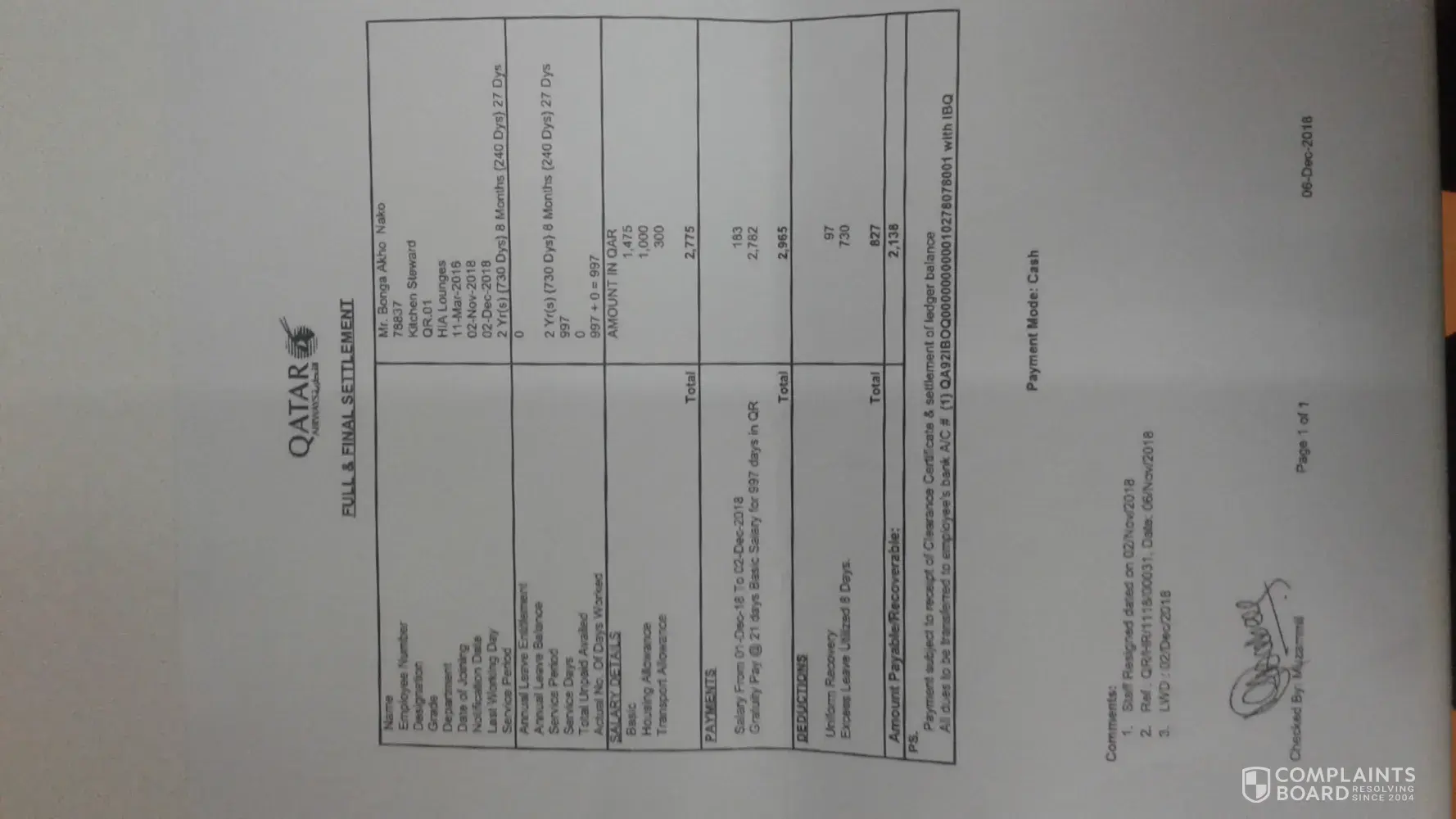 I have recently resigned from the company due to personal problems at home. I explained this to my manager. I had others issues at work which I didn't want to raise upon my resignation such as racism and favoritism which persists throughout the organization. But that's none of my business. Today I received my gratuity after two years and 9 months of service which amounted to nothing to be honest. This is complete fraud. I don't want to blame the company yet. I want to blame the people whom I delt with in HR separations today the 6th of December 2018. It's an embarrassment to sign a hand written document that I have to copy out myself. While in the official documents the amount that I had received was not recorded. I saw this and kept quite because everyone in that room seem to know what is going on and they are all in on it. It's useless to complain to them, they disregard everything. They even set you up to leave on Friday or Saturday because then offices will be closed and you won't have a chance to raise your issues to the relevant authorities because it's a weekend. I mean when I joined the company I signed official documents with the company logo and everything. Everything was done professionally. Now when I sign to receive what was promised to me on my contract i have to sign some shady papers. This is so low, it's beyond my comprehension. I received one riyal per day for my service. Hahahaha this is a joke. But the sad is that it's not funny, I would to see that part in my contract. If this is how things are done in this company then it's the most exploitative company there is. But if not, you have criminals in your corporation and they are stealing from the people whom they deem to be weak and vulnarable. But I'm not poor, I come from South Africa, I came here to see the world and experience a different culture not because I was starving and will to sell my soul for anything. Even people who work in grocery stores back home get better detailed statements for their service. This is appalling, disgusting and an embarrassment. Anyone with some brains please view the statement which I received and tell me if that makes sense to you. Anyways I know nothing will happen. What doesn't kill me will only make me stronger. You could have asked for the money if you all are that desperate, I would have been more than happy to give it to you all because your level of desparation is worrying. Honestly, I have never seen such and I don't think I will ever see such again in my life. Everyone in my family was flying Qatar airways because I used to work for you all and I never spoke about you all negatively but now you have crossed the line my friends, no one that I know will ever fly Qatar airways again, I will make sure of that, even if it's one person I will be satisfied. I can't wait for you all to escorts me out of your country like a criminal after serving you all to the best of my ability because that's how you treat us after robbing us here. Quite frankly I don't want any payments from you people, I'd starve to death if I must but you can keep it, you need it more than I do, I don't want anything to do with you all. Ever ever again.