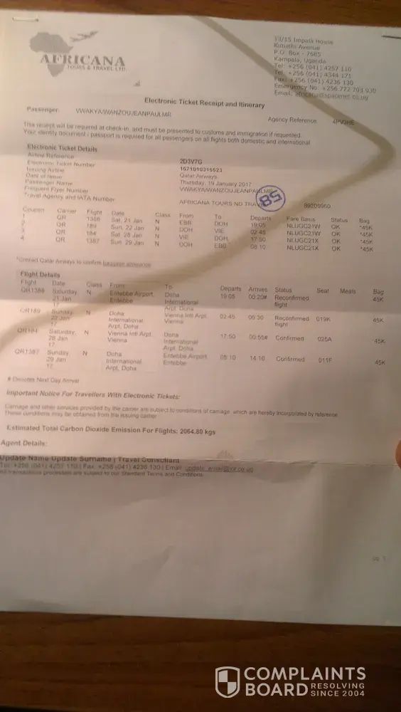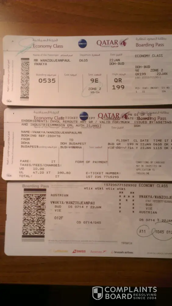 I paid a ticket for a flight Entebbe – Doha – Vienna (Airline reference: 2D3V7G, Electronic ticket number: [protected]) as you can see from the pictures attached, to attend a medical seminar on "bone and joint surgery" in Salzburg. The flight delayed for 2hours in Entebbe on the 21/01/2017, which lead me to the consequence of missing the corresponding flight to Vienne. Another flight was rearrange for me to reach Vienna via Budapest with assurance that I will find my luggage in Vienna. Surprisingly I reach Vienna late than expected by the original itinerary to allow me to attend on time the beginning of the seminar and on top of that my luggage containing my needs and my clothes against wither wasn’t there.