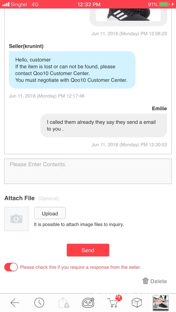 I ordered adidas shoes on May 22 2018 i wait for 2 weeks haven't deliver yet so I decided to ask to the seller then the seller replied that the item is already shipped. Then suddenly have staff of Qoo10 message me tru SMS ask me if I receive my parcel so replied no then she/he replied that she/he will inforn the office .then have someone ask me if I receive my parcel tru watsapp i said no i wait for almost 2 weeks until now haven't deliver yet then they replied they inform the delivery staff i wait for how many days i ask again they said that my order lost . So i call the customers service and she said that my order is lost so they send a email to the seller to refund the item then she said that i will ask the seller if can refund o resend the item . Then I send a message to seller i ask if possible to resend my order then they replied that i must negotiate to Qoo10 customers service then u replied that i call them already they say that they send a email to you and she/he replied me they haven't receive yet so i ask the # of the Qoo10 customers service if it is correct or not she/he replied me that they cannot confirm for me i must check by my self .